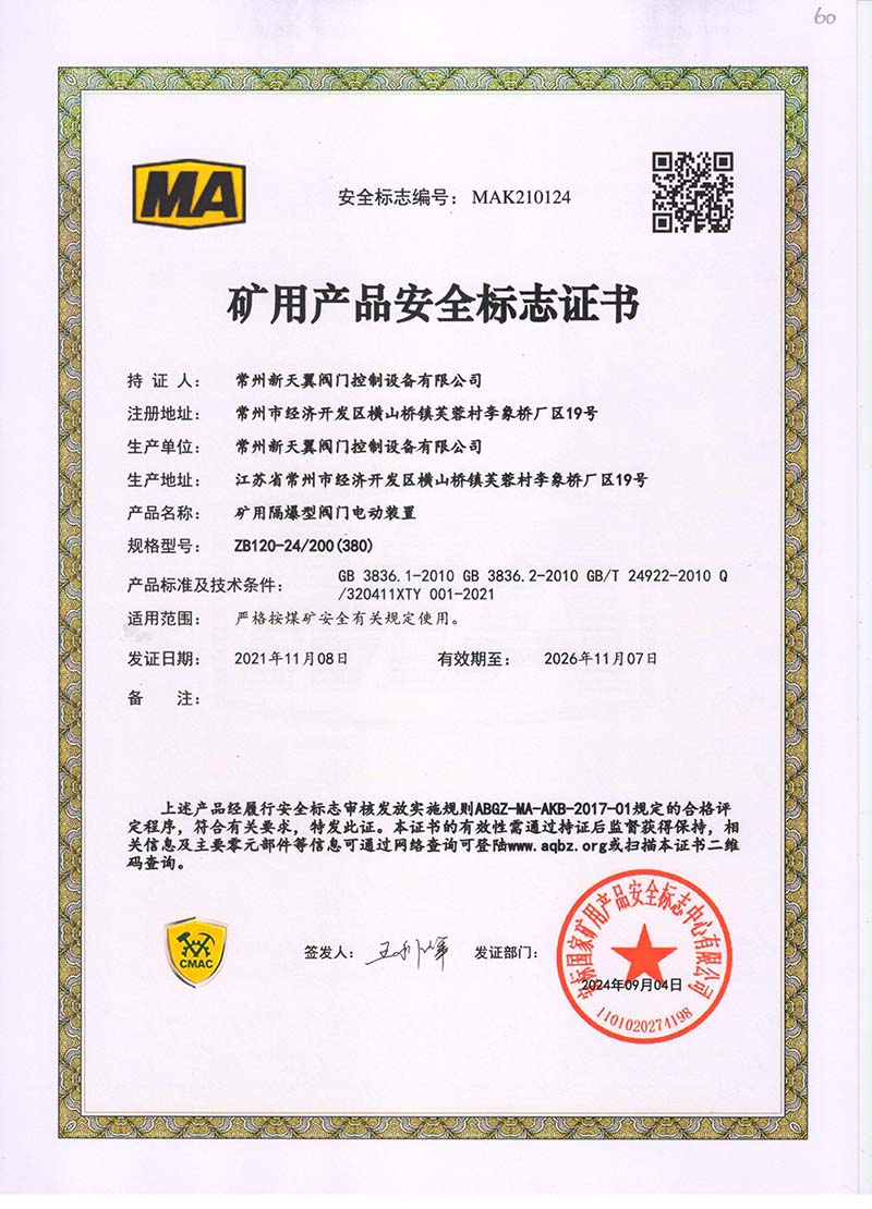 礦用產品安全標志證書ZJK60-24(380)
